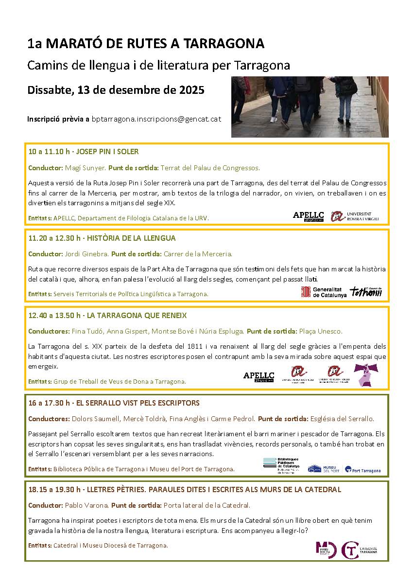 Jornada dedicada a gaudir de la llengua i la literatura amb la proposta de rutes que s'iniciaran amb Josep Pin i Soler, continuaran amb la història de la llengua, amb la descoberta de Tarragona amb Veus de dona. A la tarda descobrirem mirades literàries al barri marítim del Serrallo, i finalitzarem amb una proposta literària a la Catedral.
